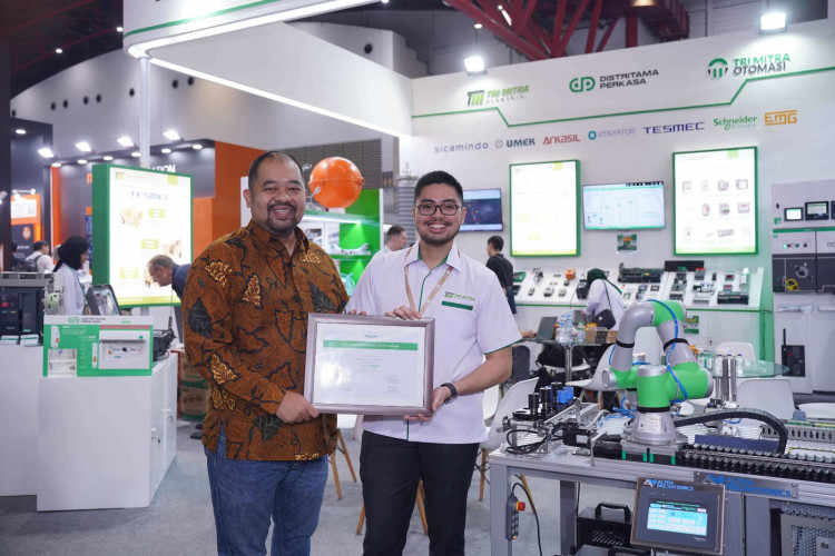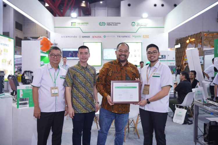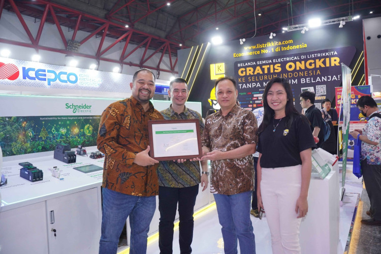 Schneider Electric secara simbolis memberikan sertifikat Best Online Partner Program (BOPP) kepada Mall-listrik.com, Automatara.com, dan Listrikkita.com dalam acara Electric & Power Indonesia di Jakarta pada Jumat (30/08).