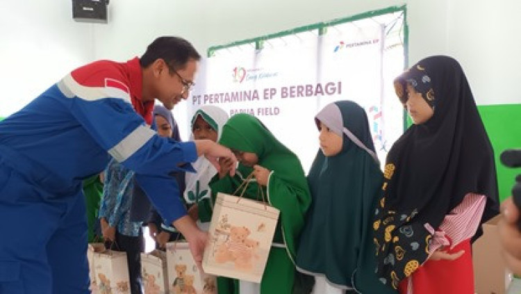 Mata berkilat dan senyum lebar merekah saat mereka menerima kantung cokelat bergambar boneka beruang yang diserahkan karyawan Pertamina EP yang berseragam biru berpadu merah. Dengan tak sabar mereka mengintip ke dalam kantung dan menemukan peralatan makan untuk menampung bekal sekolah.